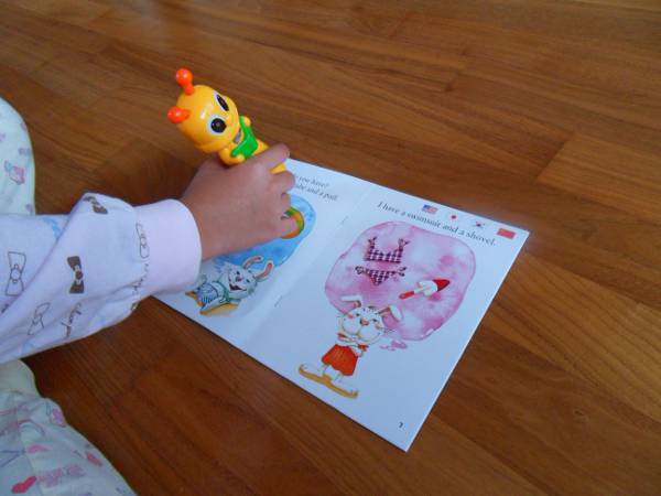 最先端機能搭載(USBメモリ、コンテンツ資料アップデート、MP3ダウンロード機能)の可愛いキャラクターTALK PENで教材の文字や絵をタッチするとTALK PENから4ヵ国語別に、正しいネイティブ発音が聞こえてきます。